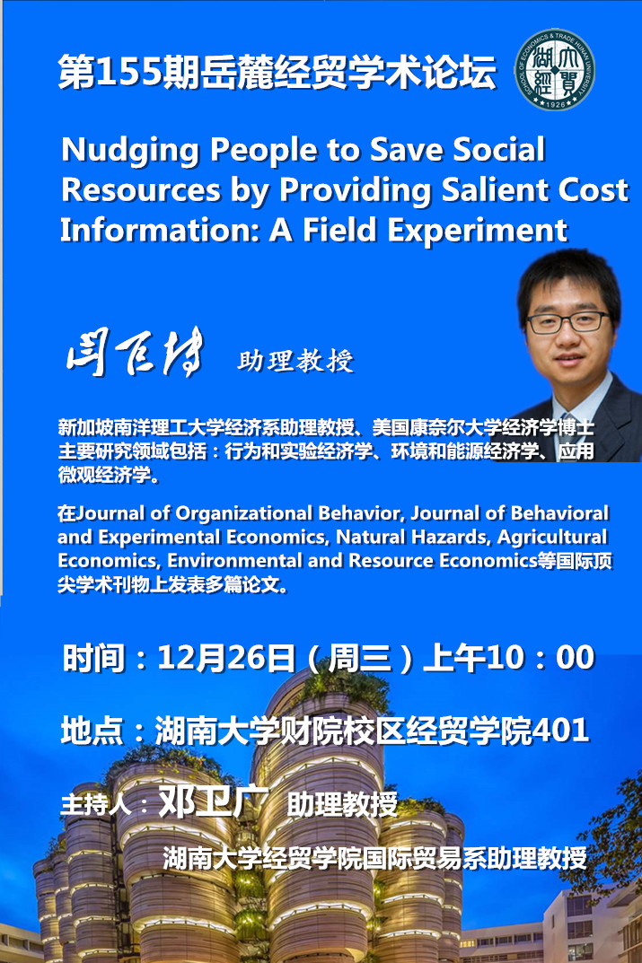 新加坡南洋理工大学经济系助理教授,美国康奈尔大学经济学博士。闫巨博博士的主要研究领域包括:行为和实验经济学、环境和能源经济学、应用微观经济学。