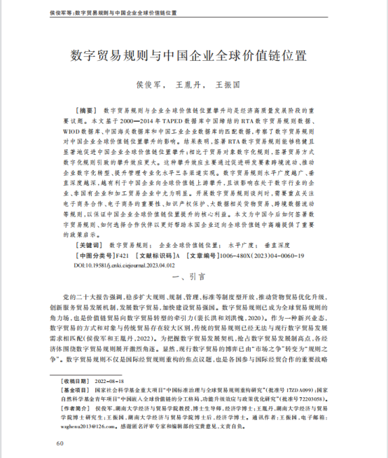 侯俊军教授、王胤丹博士以及王振国博士后合作撰写的学术论文《数字贸易规则与中国企业全球价值链位置》在《中国工业经济》2023年第4期刊出。《中国工业经济》期刊由中国社会科学院工业经济研究所主办,是我国产业经济学领域的权威学术期刊。