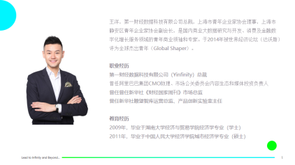 经济学专业,在校期间曾任学生会主席、院刊创刊总编辑、年级长,多次获得国家奖学金、省优秀毕业生,SIT挑战杯一等奖等多项荣誉,毕业时保送至中国人民大学攻读硕士。曾任新华社《财经国家周刊》市场总监,新华社瞭望智库运营总监、产品创新实验室主任,阿里巴巴集团CMO助理、阿里巴巴集团市场公关委员会内容生态和媒体投资负责人。现任第一财经科技有限公司(Yinfinity)总裁,上海市青年企业家协会理事,上海市静安区青年企业家协会副会长,是国内商业大数据研究与开发、消费及金融数字化增长服务领域的青年商业领袖和专家。于2014年被世界经济论坛(达沃斯)评为全球杰出青年(Global Shaper)。