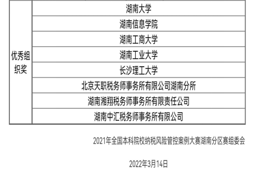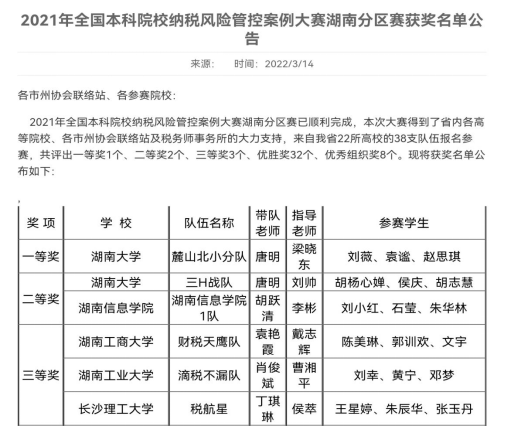 2021年全国本科院校纳税风险管控案例大赛于2021年12月11日开赛,共有425所高校、763支代表队参赛,比赛设分区赛和决赛两个阶段,分区赛包括税法知识竞赛和案例编写两项内容。湖南分区赛由来自省22所院校的38支队伍参赛,共评出一等奖1个、二等奖2个、三等奖3个、优胜奖32个、优秀组织奖8个。