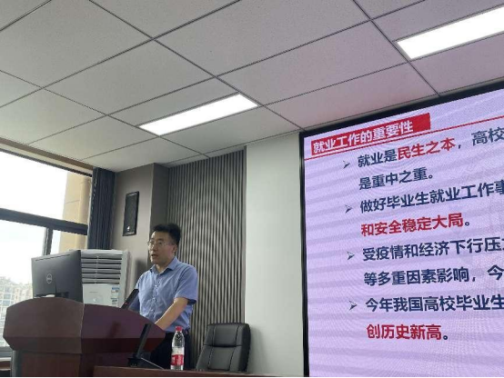 招生与就业指导处刘明然副处长分析了学院就业形势、2022届毕业生就业情况,强调同学们一定要尽早树立求职意识,抓住秋招黄金时期,增强职业生涯规划能力,调整就业策略,为充分就业、满意就业打好思想基础。