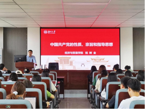 祝树金讲授《中国共产党的性质、宗旨和指导思想》专题党课。他结合历史发展和现阶段热点详细讲授了党的性质、宗旨和指导思想,强调全体学员要牢记“全心全意为人民服务”的宗旨,结合自己的实际情况将行动落到实处,无论是在校期间还是走上社会,都应当牢记初心。他指出,同学们要坚持学用结合,将“经世致用”和理论知识结合在一起,学会用党的先进理论分析和解决实际问题。
