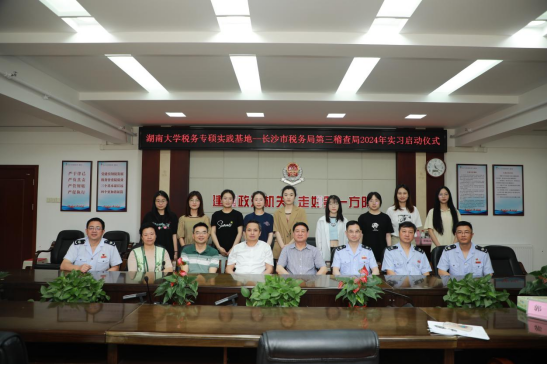 携手国家税务总局长沙税务局第三稽查局联合举办2024年实习启动仪式。长沙市税务局第三稽查局党委书记、局长杜峰、副局长刘信、副局长伏拓元、办公室主任曲植、学院税务学位点负责人谭光荣、财政税务系教授郭平、专业学位教务秘书蔡瀚枢以及税务专业硕士实习生参加仪式。仪式由长沙市税务局第三稽查局副局长欧耀清主持。