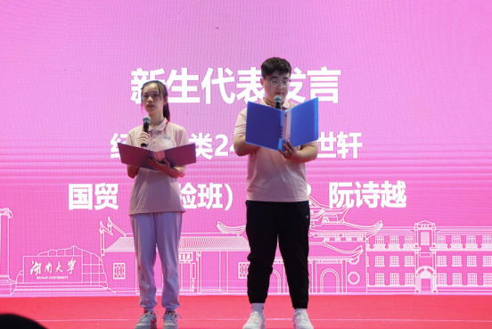 新生代表王世轩、阮诗越分享了自己志愿填报的心路历程,表达了对学校、学院的老师和学长学姐们的感谢,对未来多姿多彩的校园学习生活充满期待,希望往后和同学们找准目标、共同前行,做一个心怀担当、敢闯敢干、意气风发、满腹壮志的大学生。