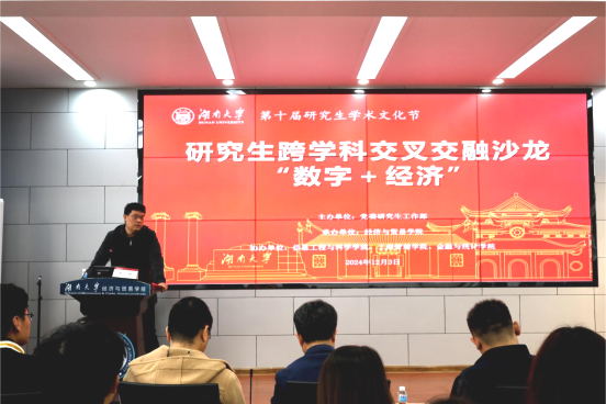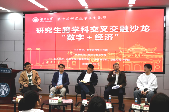 近日,研究生跨学科交叉交融沙龙第二期在财院校区行政楼201举行。特别邀请长沙市数据局副局长吴进、信息科学与工程学院教授荣辉桂、吉林大学长沙汽车创新研究院副院长赵军、北京大学长沙计算与数字经济研究院主任助理白曾鼎、金融与统计学院硕士研究生丁怡帆等五位师生以“数字+经济”为话题开展交流。本次沙龙由做爱影片