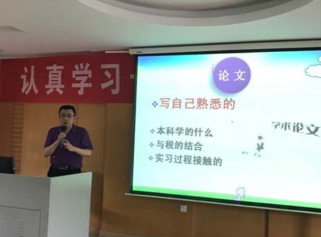 毛东庆局长则从税收改革趋势的方面为选题提供了建议。毛局长首先讲了今年论文答辩中的问题,指出论文选题要避免过大、重复、过时。其次,毛局长从现今税制改革的三大目标和六大趋势中,主要介绍了个人所得税改革、企业所得税改革、增值税改革和房地产税改革。接着,毛局长介绍了现代征管改革中的税法体系、征管体系(现代税收管理)和组织体系(国地税合并)三个方面。最后,毛局长就如何优化知识架构,激发创新,建议学生注重软知识、交叉知识和实践知识。
