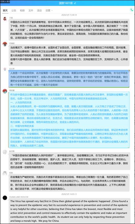2016级、2019级本科生于9日下午通过班级、年级组织线上会议集中观看,共计435人,观看过程中不少同学在群组中发起讨论,表达自己对本次疫情的看法。其中2016级留学生ISSAKA LABO BOUCHE也积极参与讨论,她提到:“本次疫情传播很快,中国在疫情防控和治疗方面拥有领先的技术和经验,中国采取了最勇敢、最灵活的严格预防和控制措施,为世界公共卫生提供了重要贡献。作为学生,我们只有尊重这些预防措施,保持高尚道德,才能有所帮助。”2019级国际经济与贸易魏珈谈到:“何谓大国?在今天的这一堂课里,我得到了这道题的答案。我们或许不能像医护人员一样勇敢冲上前锋,也不能如警察一般稳重的保护身后,但我们依然有着为祖国而不断流淌的血液。这场疫情战,我们必将获得胜利!”