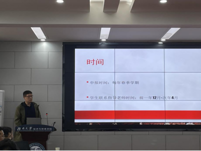 青年教师舒扬以三大赛项目评审和指导经验分享为主题向在场的青年教师们介绍了“互联网+”“挑战杯”和“创青春”三大赛事的区别以及历年以来三大赛事评审要点的主要变化,强调要充分调动参赛学生的积极性,发挥学生的主体作用。