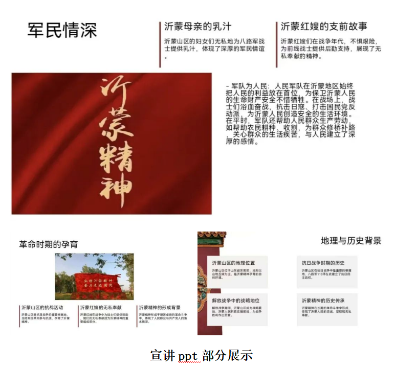 在此之后,宣讲成员王怡璇、董丽华阐述了沂蒙精神在不同历史时期的作用,如推动抗战、解放战争胜利,促进新中国建设和改革开放发展。吕祚宇、叶子豪则强调了其在现代推动社区和谐、促进公平正义、激励青年成长等方面的价值。