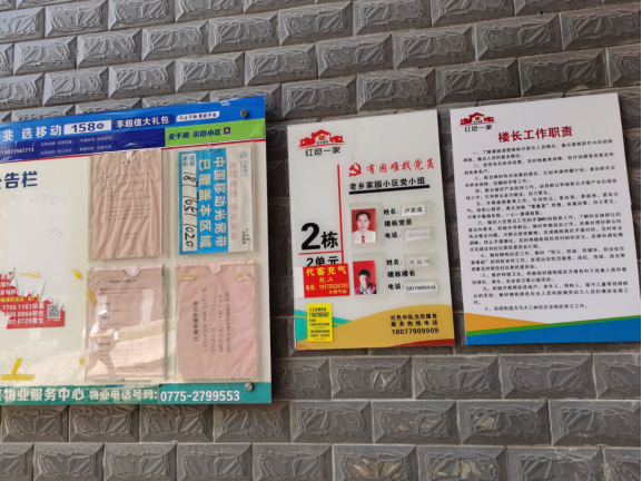 大乙岭社区于2018年六月成立,辖区内有老乡家园、公租房小区、廉租房小区三个居民小区。其中老乡家园已安置易地搬迁贫困户7113117人,常住人口1700多人,配套有卫生所、儿童之家、职工之家、“广西青空间”等设施。社区幼儿园、中小学、第三人民医院、农贸市场正在建设之中。从李书记处了解到,目前在安置区内的常住居民主要为老人和小孩,为了保证居民们的生活质量和安全保障,每两栋楼配备一位社区干部进行管理,每一栋楼通过公开投票从楼房住户中推选一位楼长,负责和居民联系沟通。居民们在日常生活中遇到困难和问题时也可积极寻求社区委员会的帮助,及时反馈情况。