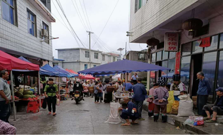 小组成员前往的第一天——7月21日,刚好遇上了当地居民提到的“五天一次”的赶集。集市并非是城市里形成的专门的菜市场,而是由各个小摊贩组成,摊位位于街道的两侧,集市商品种类丰富,不仅有肉类、水果和蔬菜,还有染发剂等生活用品出售。集市上,人们不急不忙地挑选商品,毫无快节奏生活中“完成任务式”的购物状态;人群中,许多老奶奶将选好的物品装入背上的竹篓子中,丝毫不担心会有人“顺手牵羊”。小组成员体验到了当地慢节奏的生活和淳朴的民风。