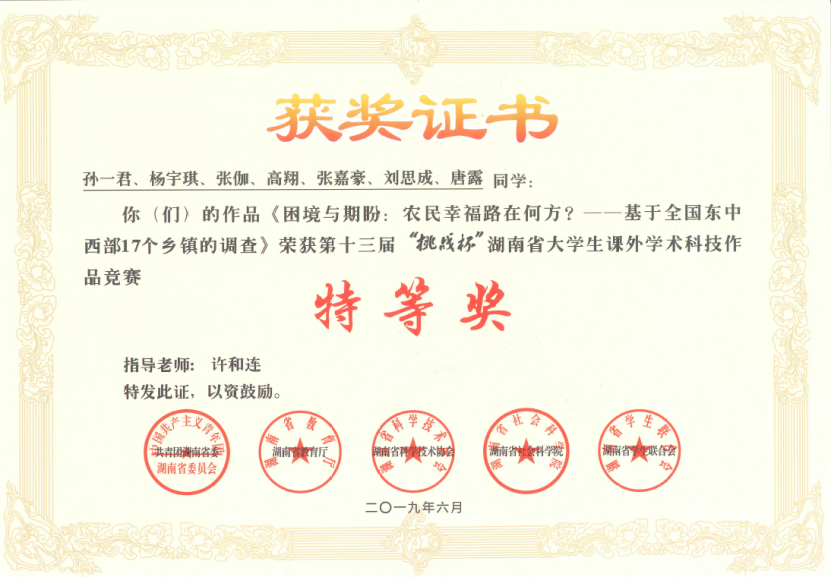 其中,《困境与期盼:农民幸福路在何方——基于全国东中西部17个乡镇的调查》一文在2019年6月份获得了挑战杯湖南省特等奖(全省仅8个)的荣誉、并于同年11月份获得了挑战杯全国一等奖的殊荣,创造了经贸学院在该项赛事的最好成绩。