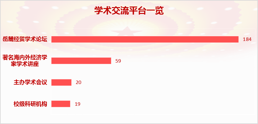学院党委坚持积极主动的学术交流,促进学术思维的碰撞,积极营造良好的科研氛围学院承办的岳麓经贸学术论坛已经累计开展184期。2016-2019年间学院共主办学术会议20场,包括第一届至第四届“标准化与治理”国际学术研讨会“强力打造内陆港与建设开放强省”高峰论坛新时代中国特色社会主义财政理论研讨会暨2018年全国高校财政学教学研究会常务理事会等高端会议。邀请国内外首席专家、著名经济学家进行学术讲座共计59场。新增校级科研机构“区域经济研究中心”,目前学院设立校级科研机构达19个。