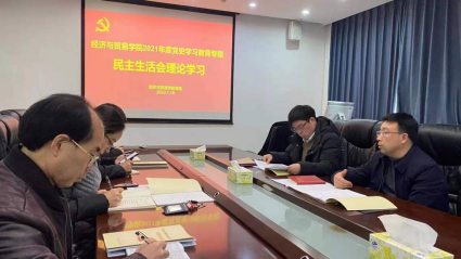 1月10日下午,经济与贸易学院在经贸大楼617会议室召开2021年度处级党员领导干部民主生活会理论学习会。学院副处级以上院领导、组织干事参会。会议由党委书记祝树金主持。