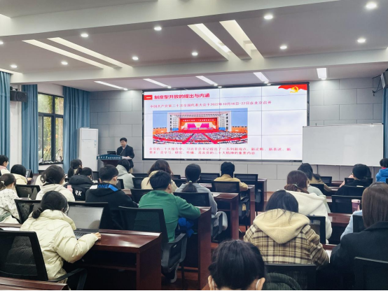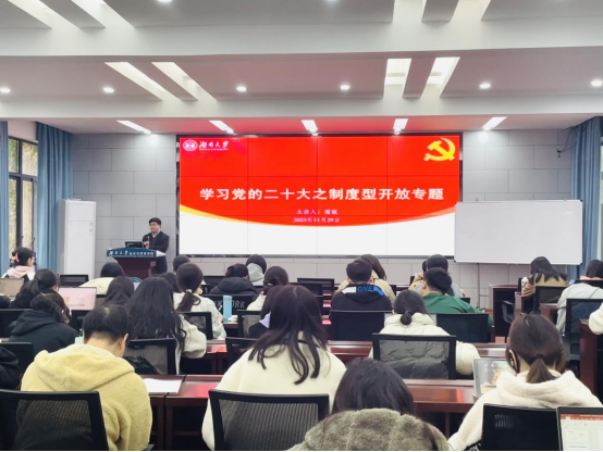 2022年11月29日,做爱影片 党委召开“学习党的二十大精神之稳步扩大制度型开放”专题党课,学院党委委员、学院副院长谢锐主讲,第73期入党积极分子同学参加本次党课。